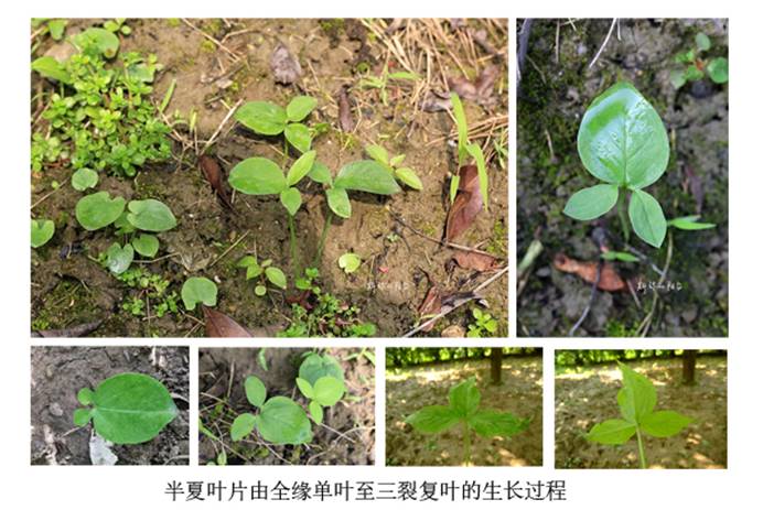 半夏1年生的幼苗叶片呈卵状心形至戟形,为全缘单叶;2~3年后才发育为3小叶的复叶,小叶椭圆形至披针形,中间小叶较大,两侧的较小,叶片两面光滑无毛。