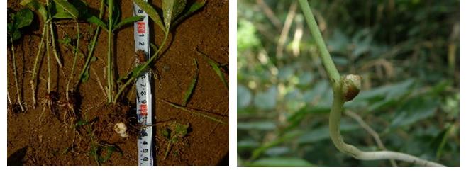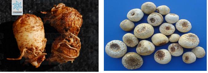 半夏的块茎近球形,直径1~2cm,有须根。叶柄长15-20厘米,叶柄基部有珠芽,珠芽在母株上萌发或落地后萌发。