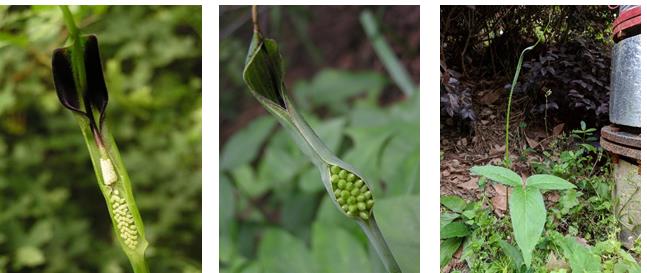 天南星科植物最明显的特征就是肉穗花序和佛焰苞,花序柄长25~35厘米,长于叶柄;同一植株的雌雄花序包裹在同一佛焰苞里。佛焰苞绿色或绿白色;成熟后的浆果呈卵状椭圆形,黄绿色。还有一 “S”形鼠尾状的附属物延伸出在佛焰苞外,像不像一个眼镜蛇在吐着信子?